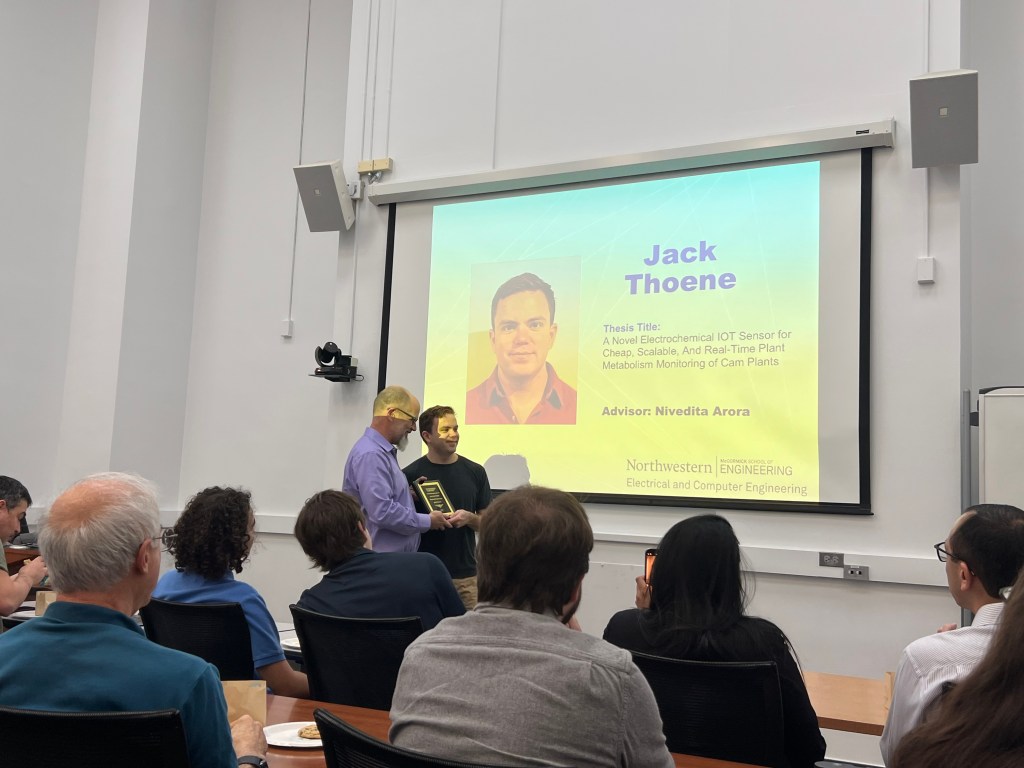 Jack Thoene (MS ’25) received the Best Electrical Engineering MS Thesis Award. Thoene, advised by Arora, investigated “A Novel Electrochemical IOT Sensor for Cheap, Scalable, And Real-Time Plant Metabolism Monitoring of Cam Plants.”