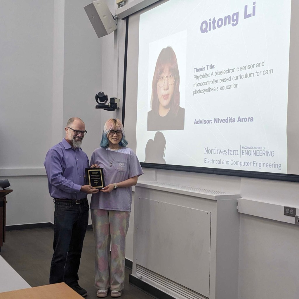 Qitong Li (MS ’25) won the Best Computer Engineering MS Thesis Award for “Phytobits: A Bioelectronic Sensor and Microcontroller-Based Curriculum for Cam Photosynthesis Education.” Li, a member of the VAK Sustainable Computing Lab, was advised by Nivedita Arora, the Allen K. and Johnnie Cordell Breed Junior Professor of Design and assistant professor of electrical and computer engineering and computer science.