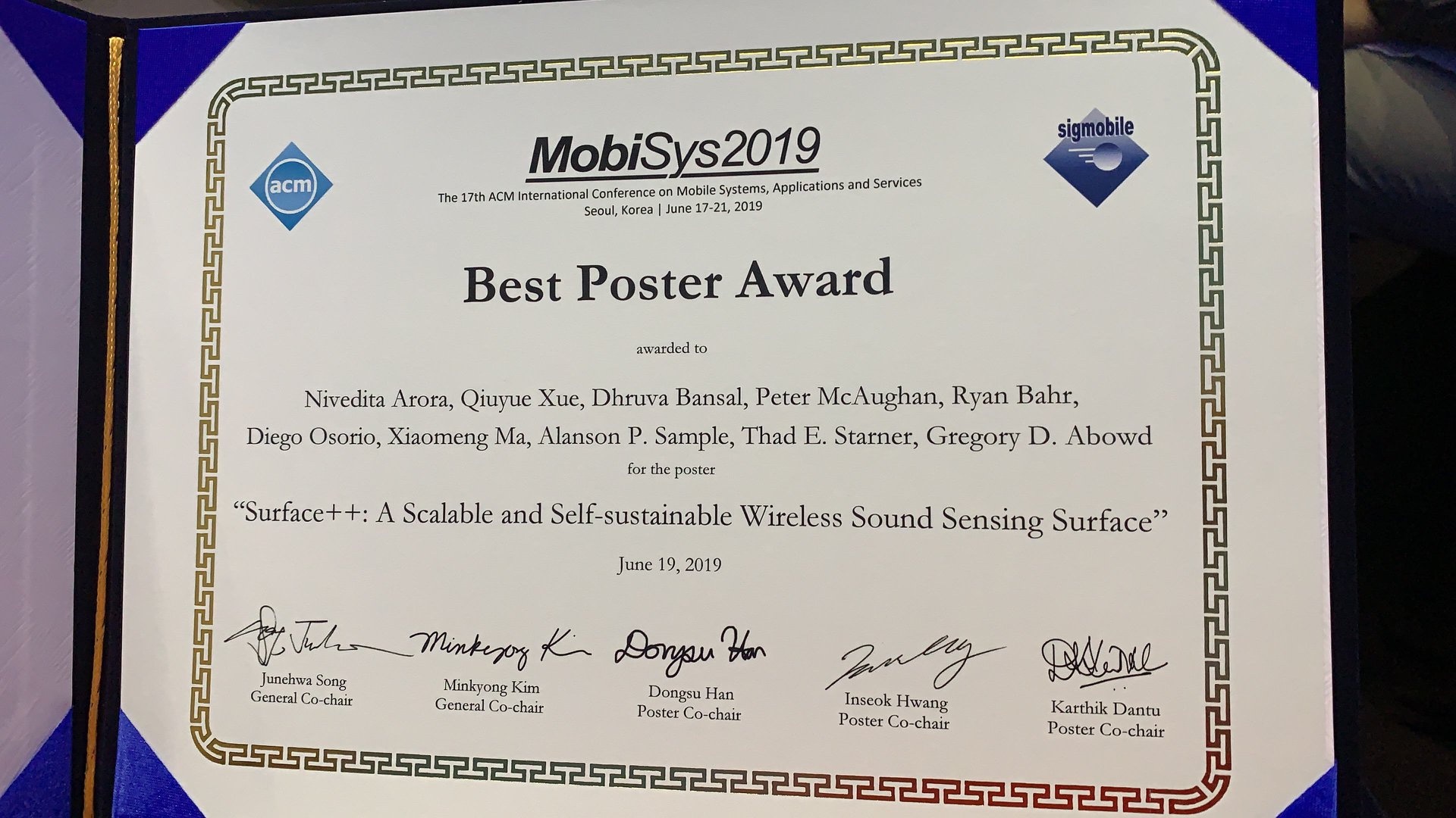 - 2018 Best Poster ACM UIST for “Zero Energy Ubiquitous Sound Sensing Surface”